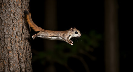 A flying squirrel with a camera in a dark forest at night