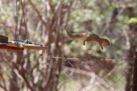 Tree Squirrel (Paraxerus cepapi) leaping from a tree to a bird feeder in a private reserve in South Africa