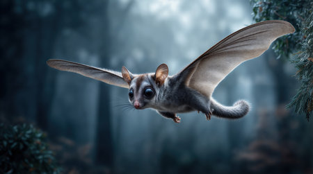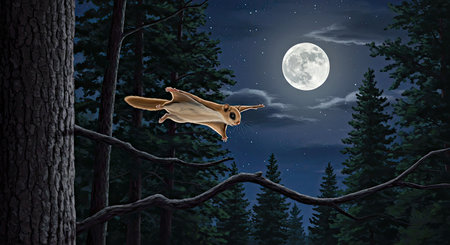 Flying squirrel in the night sky above the forest. Mixed media