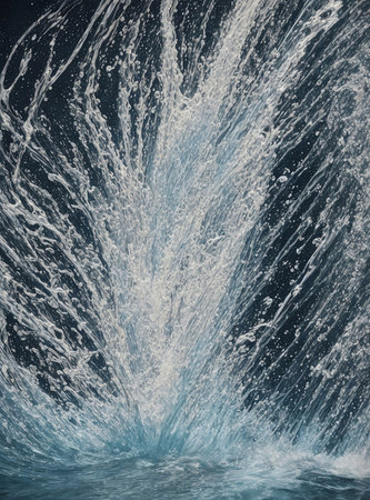 A splash of water is captured in a photo, with the water droplets falling from the sky. Concept of movement and energy, as the water droplets seem to be in motion