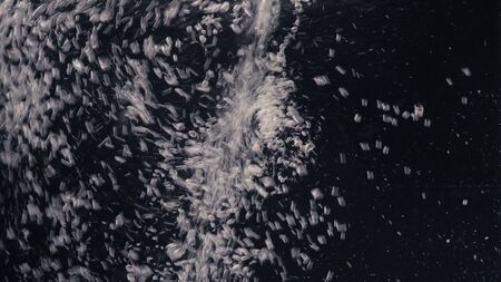 A large amount of water droplets falling from the sky. The water droplets are scattered all over the image, creating a sense of chaos and movement. Scene is one of unpredictability and energy