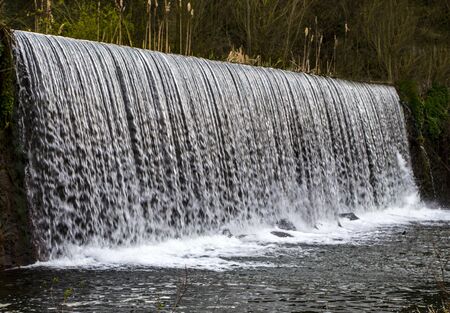 Dam to regulate the water level in the river. Falling water monochrome with strong bursts