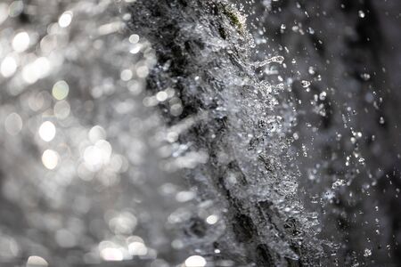 Water splash in a small river, close up of a water splash Water droplets / watercourse with reflections in the sunlight.