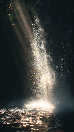 A powerful waterfall plunges into a clear pool, creating a misty atmosphere. The image showcases the water's movement and texture. Sunlight streams through the scene, illuminating the water and surrounding vegetation. This scene could be used for various commercial and editorial purposes.