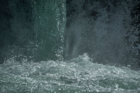 Waterfall is shown in the image, with the water flowing down a steep slope. The water is white and clear, and it is a powerful force of nature. Concept of awe and wonder at the beauty