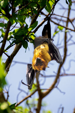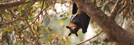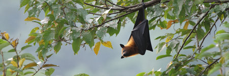 Bat (Lyle's flying fox, Pteropus lylei or Pteropodidae) perched hanging on a tree in the wild