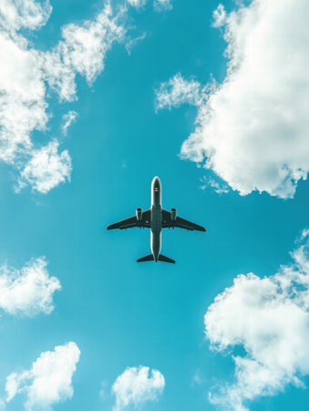 An airplane soars through the sky, surrounded by fluffy clouds and bright blue, showing the freedom of air travel on a sunny day.