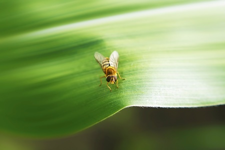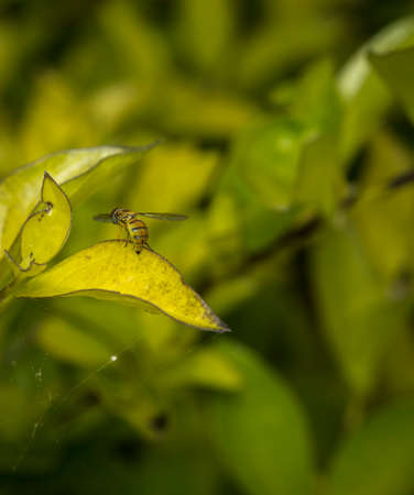 Toxomerus marginatus or flower fly on a green leaf