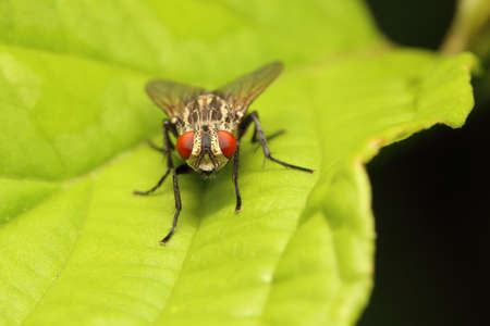 Macro fly perched on a leaf in the garden.