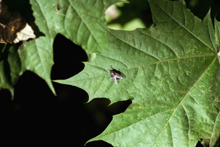 A fly perches on a green maple leaf