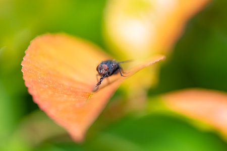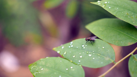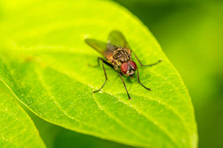 Close up a Fly on green leaf and nature blurred background, Common housefly, Colorful insect, Selective focus.