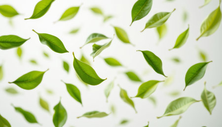 Green tea leaves floating in mid air with fresh vibrant green color and natural texture creating lively and refreshing atmosphere