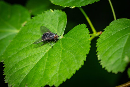 Blowfly, carrion fly, black fly sitting on a green leaf, close up view. Natural background.