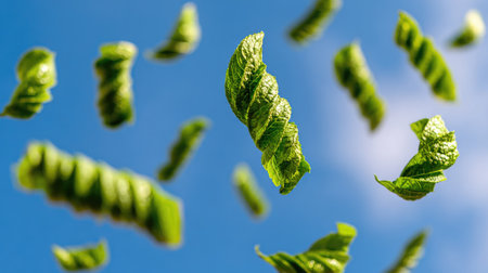 Numerous spiraling green leaves are suspended against a bright blue sky. The composition features a shallow depth of field, with some leaves in sharp focus and others blurred. The lighting suggests a daytime setting. This image could be used for various commercial projects related to nature or abstract concepts.