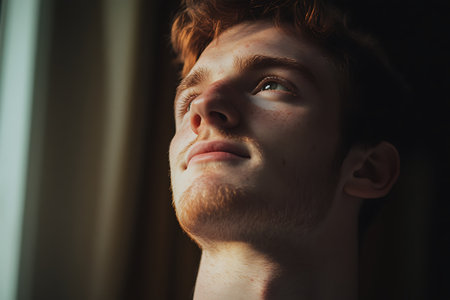 A young man with curly hair and freckles smiles gently while sitting indoors. Soft sunlight filters through the window, creating a cozy atmosphere as he enjoys a peaceful moment.