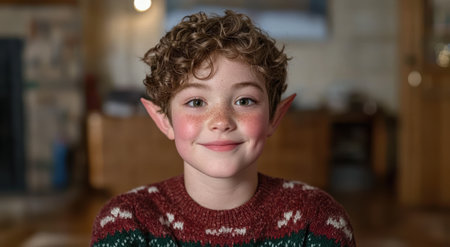 A delightful young Armenian boy stands against a backdrop of twinkling lights, radiating joy and innocence.