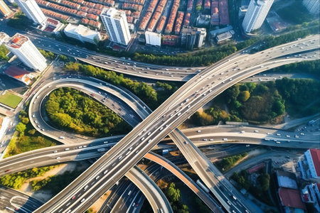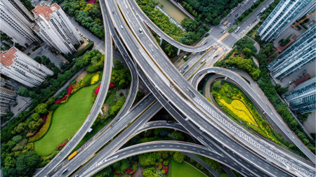 Stunning aerial perspective of a busy highway interchange surrounded by lush greenery and modern buildings showcases the blend of nature and urban infrastructure.