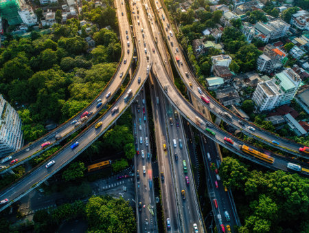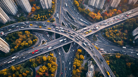 Busy expressway overhead view with urban traffic, vital infrastructure in megacity