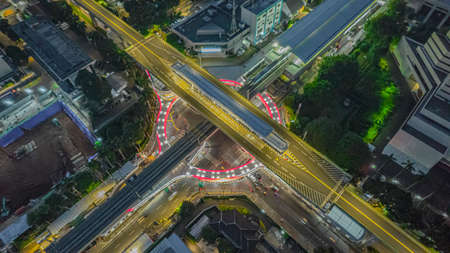 Aerial top down view on massive multi-level interchange on Jakarta city on a sunny summer day with light traffic