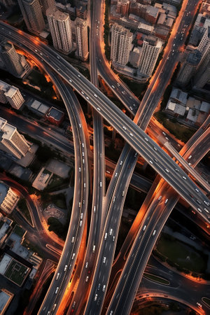 Captivating aerial view of a busy highway interchange at sunset, showcasing vehicles moving through dramatic urban landscape, capturing the essence of modern transport infrastructure.