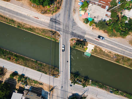 Aerial top view of highway, Transport city junction road with car on Intersection cross road shot by drone