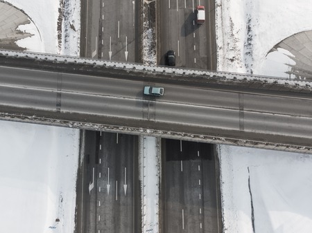Aerial view of country road and bridge, road traffic, snow-covered forests and fields, winter. Russia, St. Petersburg