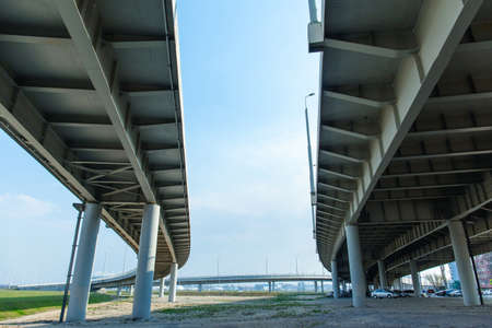Highway overpass in Kazan, Russia, under view of the concrete pillars. The concept of urbanization.
