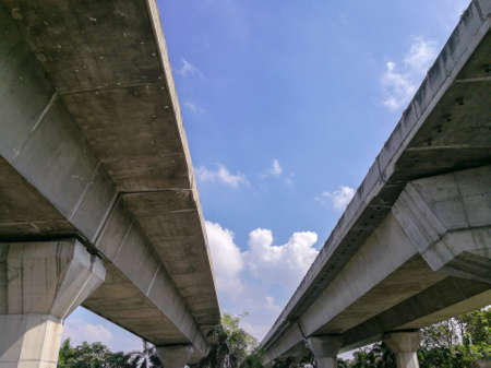 Bottom view of BTS Skytrain tracks in Bangkok, Thailand. With beautiful sky and clouds backgrond. Built with a strong concrete structure by construction from the company experienced