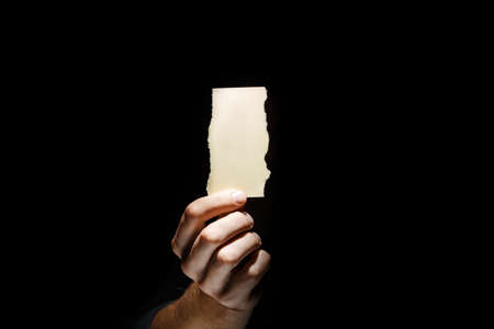 Blank scrap of craft paper in male hands on a black isolated background Scrapbook message concept.