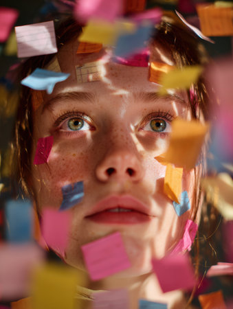 A young woman gazes upward, surrounded by colorful pieces of paper symbolizing goals and worries in a vibrant, creative atmosphere