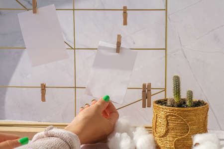 Woman creating mood board. Cards and posters mock ups on grid board. Copy space. Feminine hipster office table decoration. Home office desktop. Freelance bloggers workplace. Cactuses