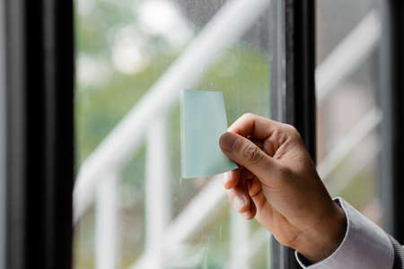 Blank colorful adhesive note stick on windows in raining day. Copy space.