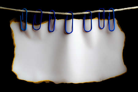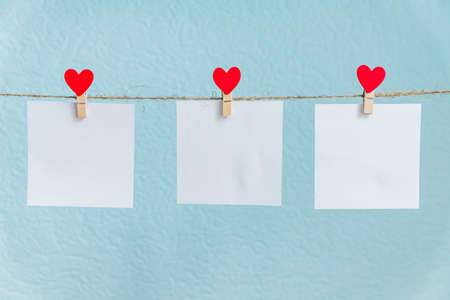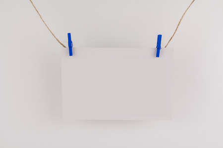 Empty white sheets of paper in a row hanging on a string, copy space for pictures and text, message communication and marketing background