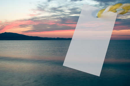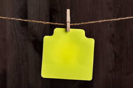 Blank yellow paper card hang with clothespin on rope. Copy space. Place for your text. Wooden background