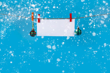 Christmas decorations hang on a rope on a blue background. Place for your text. Christmas card.