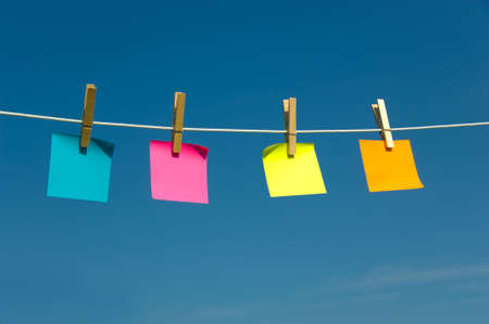 Colored sticky notes on a clothesline with a blue sky backgroung