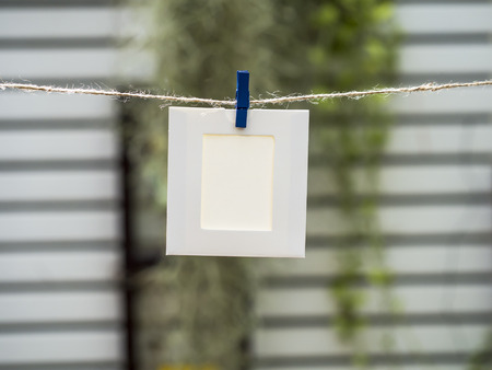 Blank instant photo hanging on the clothesline. Isolated on black background