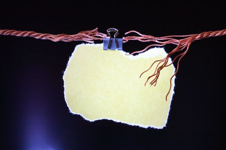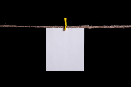 Blank yellow paper sheet for your notes hanging on dark background with rope
