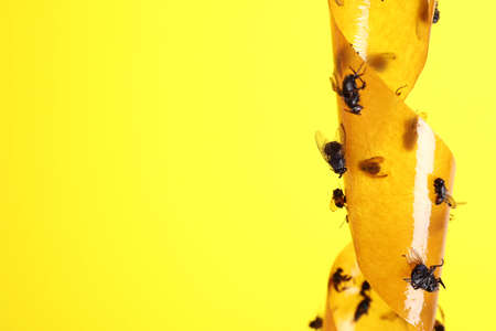 Sticky insect tape with dead flies on yellow background, closeup. Space for text