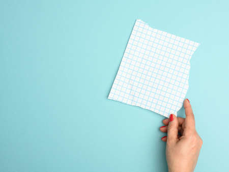 female hand holding a torn blank sheet of paper in a cage on a blue background