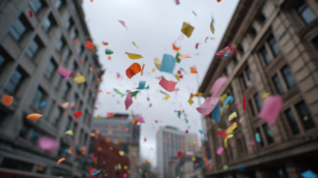 A burst of colorful confetti dances in the air of an urban street, bringing joy and vibrancy to a festive celebration beneath overcast skies.