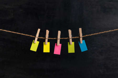 Small bright paper hang with clothespins on rope. Black background. Copy space. Place for your text