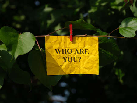 A yellow paper note with the question Who are you on it hanging of a tree branch with a clothespin. Close up.