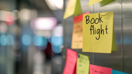 Busy office environment with colorful sticky notes flying through the air. Workers are focused on tasks amidst the chaos, highlighting themes of multitasking and time management stress