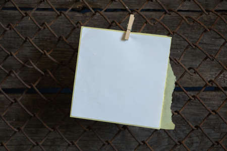 white sheet of paper paper hanging on a clothespin on a grid on the fence, place for text