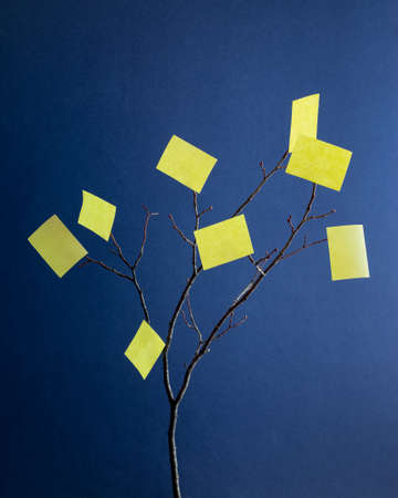 Yellow sheets of paper on a tree branch. Mock up. Art. design