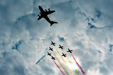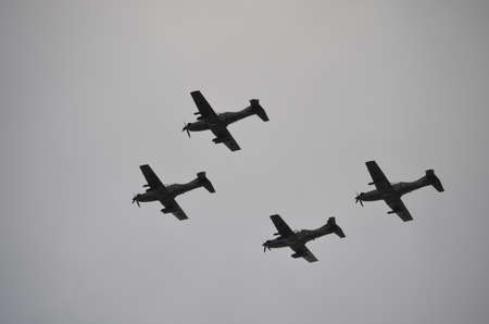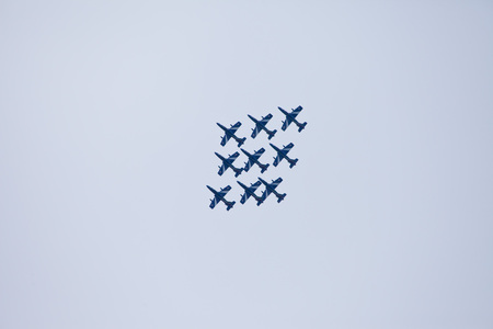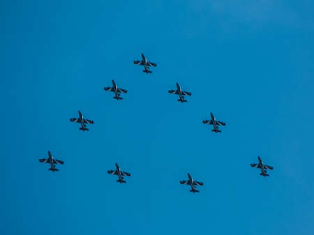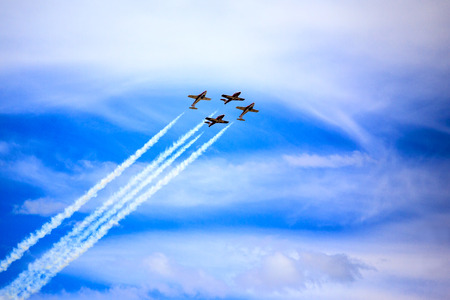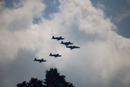 Radom, Poland- August 24, 2018: A group of aircrafts flies during air show