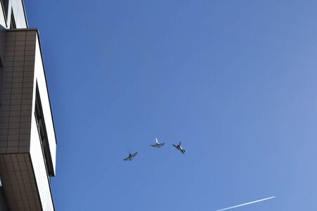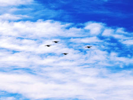 Victory parade of military aircraft over the city. Representation of aviation equipment. Group of army air force shows aerobatics in blue sky against background of clouds.