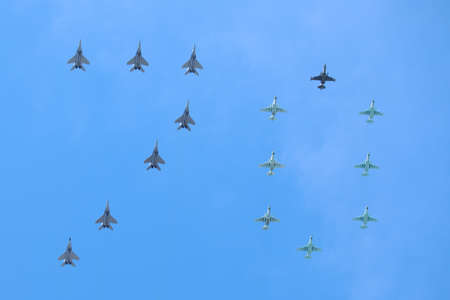 military fighters MiG-29 and attack planes Su-25 during traditional military parade to mark the 70th anniversary of Victory in Great Patriotic War in blue cloudy sky, Moscow