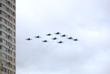 MOSCOW, RUSSIA - May 9, 2021: Group of Russian military supersonic high-altitude interceptors SU-34, SU-35, SU-30SM fast flying close to building during parade